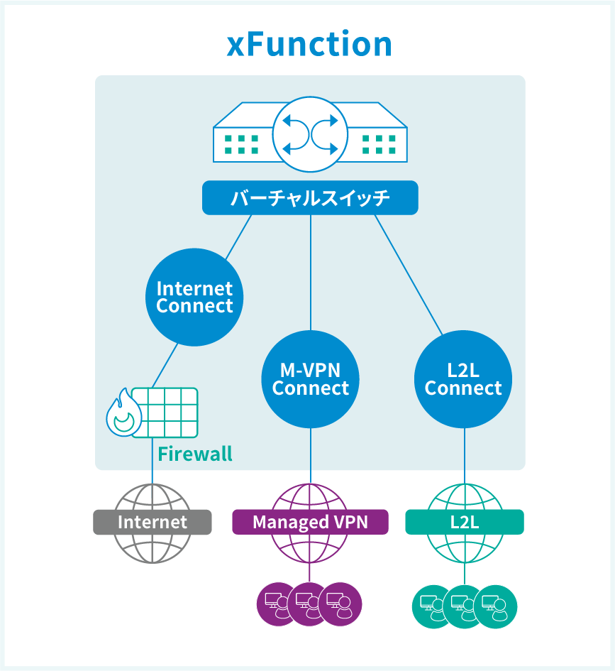 xFunctionのバーチャルスイッチでは、L2L、マネージドVPNをそれぞれ接続させることが可能であり、お客さまの拠点の規模や求められる通信品質により、最適な当社ネットワークサービスを選択していただき、それらのネットワークサービスをxFunctionのバーチャルスイッチにて接続します。