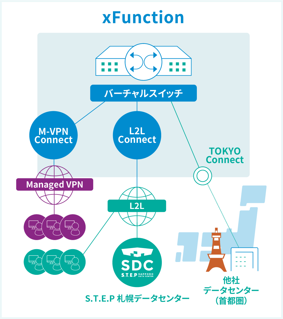 首都圏のお客さま向けにxFunctionに接続された「S.T.E.P 札幌データセンター」や「S.T.E.P プライベートクラウド」等のサービスとの相互接続性を提供致します。