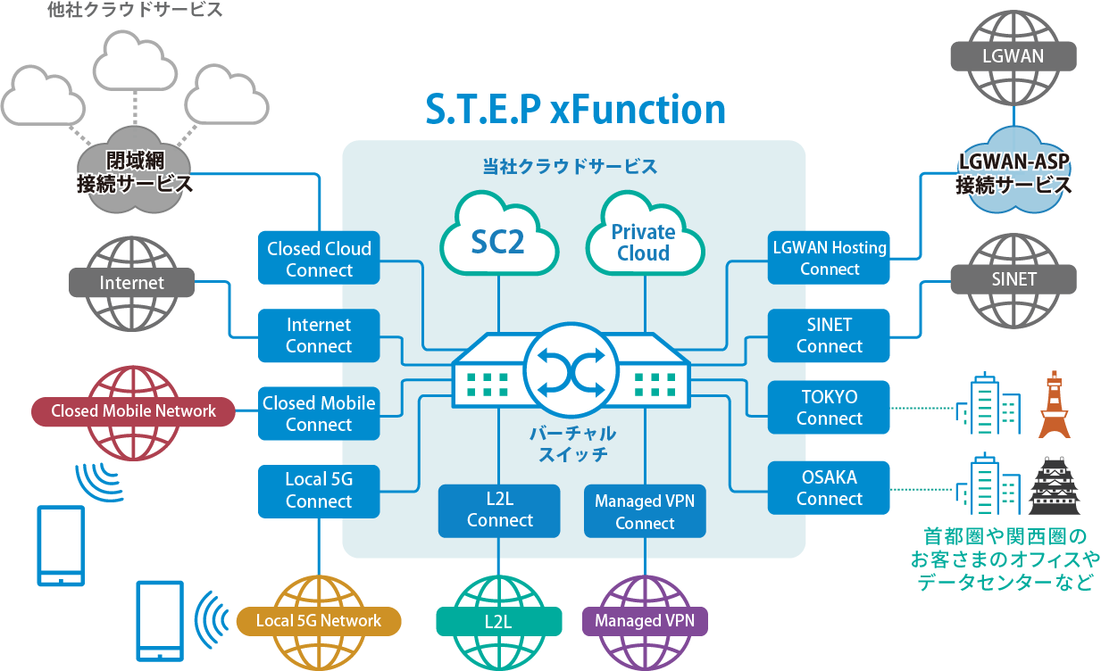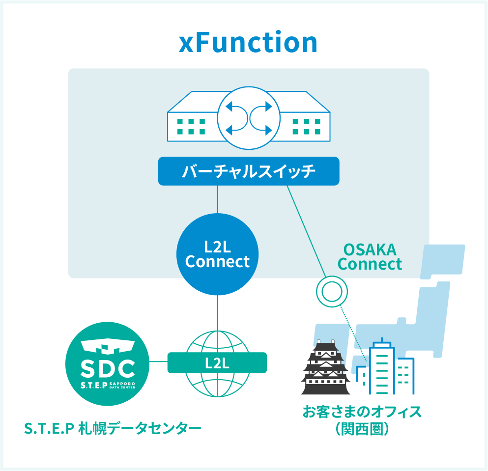 関西圏のお客さま向けにxFunctionに接続された「S.T.E.P 札幌データセンター」や「S.T.E.P プライベートクラウド」等のサービスとの相互接続性を提供致します。
