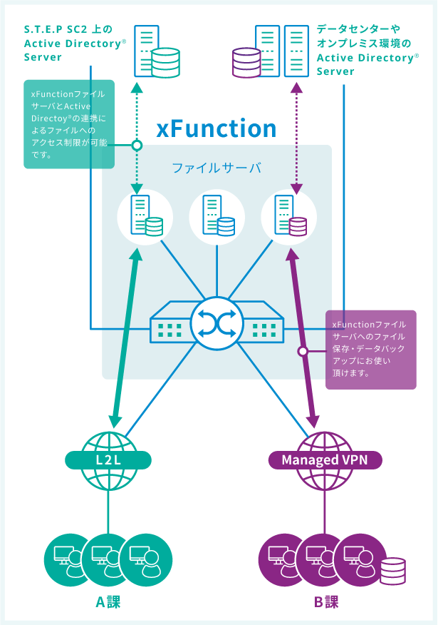 ※xFunctionで提供する機能には、S.T.E.P 札幌データセンター・SC2・プライベートクラウド・各種アプリケーションサービス・L2L・マネージドVPNの提供機能は含まれません。L2L・マネージドVPN・S.T.E.P 札幌データセンター・SC2・プライベートクラウドなどの各種サービスを併用される場合は、それぞれの契約約款・利用規約に基づいた料金が別途発生致します。